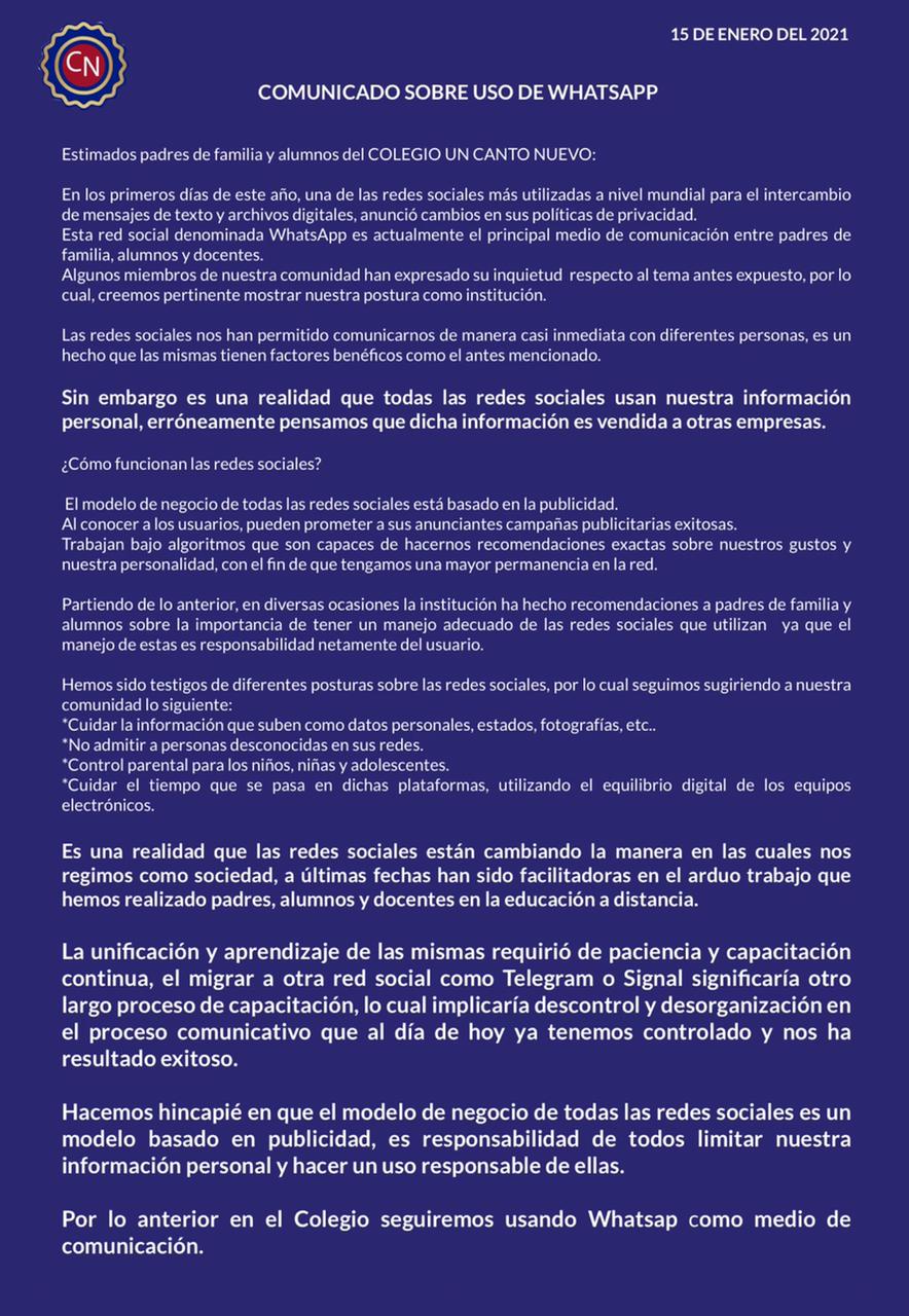 COMUNICADO SOBRE EL USO DE WHATSAPP